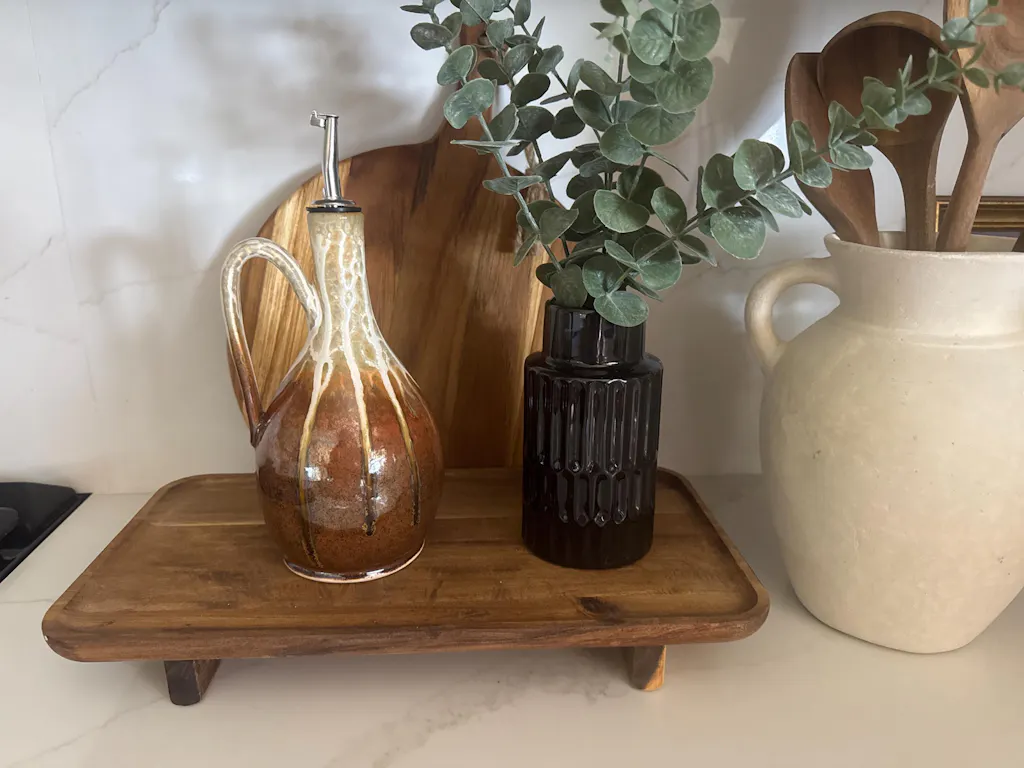 This large ceramic olive oil dispenser in amber brown with a yellow drip glaze holds 24 oz, making it ideal for anyone who cooks regularly and doesn’t want to think about refilling their oil bottle too frequently.