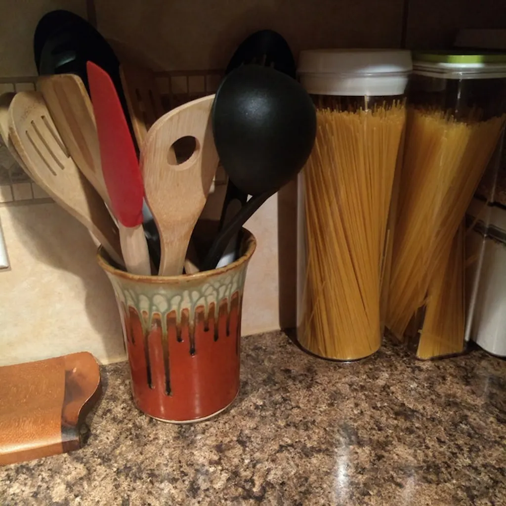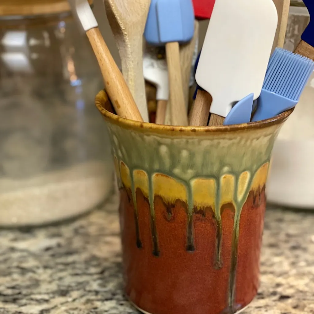 Our Handmade Ceramic Utensil Holder in rustic red with a green drip glaze can be used in different ways around the house, such as a kitchen utensil crock, ceramic flower pot, flower vase, and for organizing paintbrushes or any other working tools.